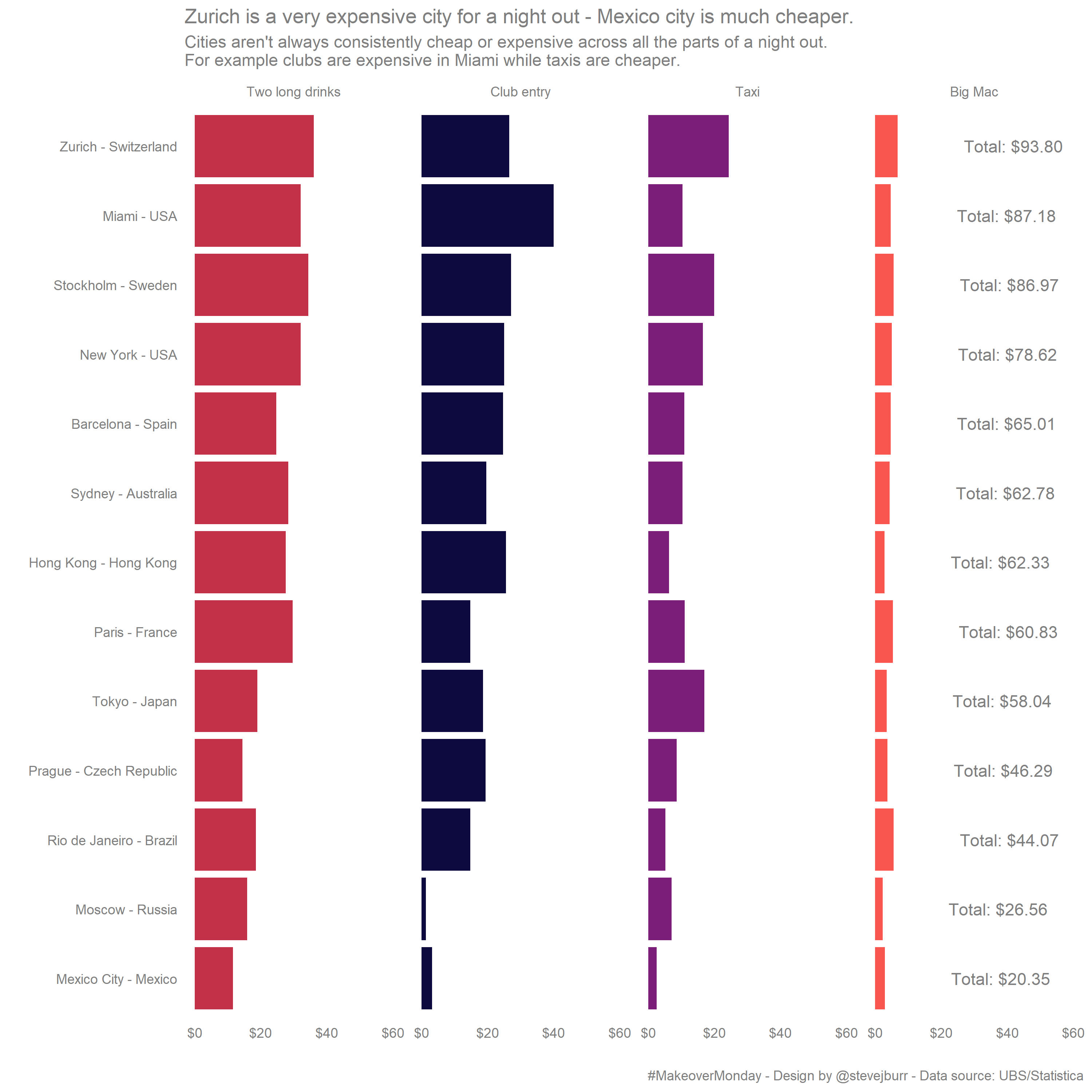 The subject of #MakeoverMonday this week was a chart by Statistica looking at the cost of a night out in a variety of cities around the world.